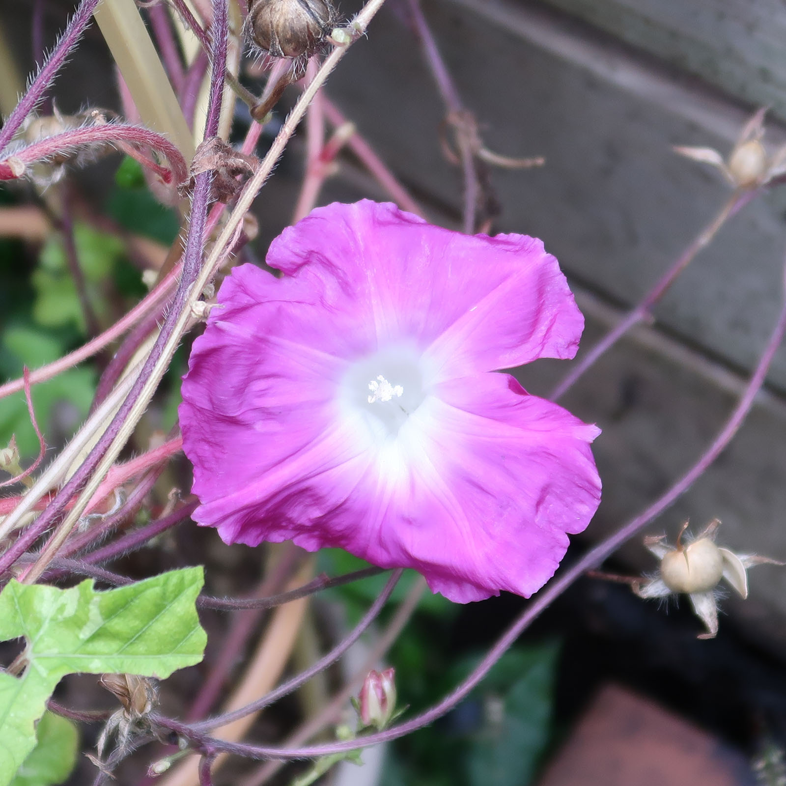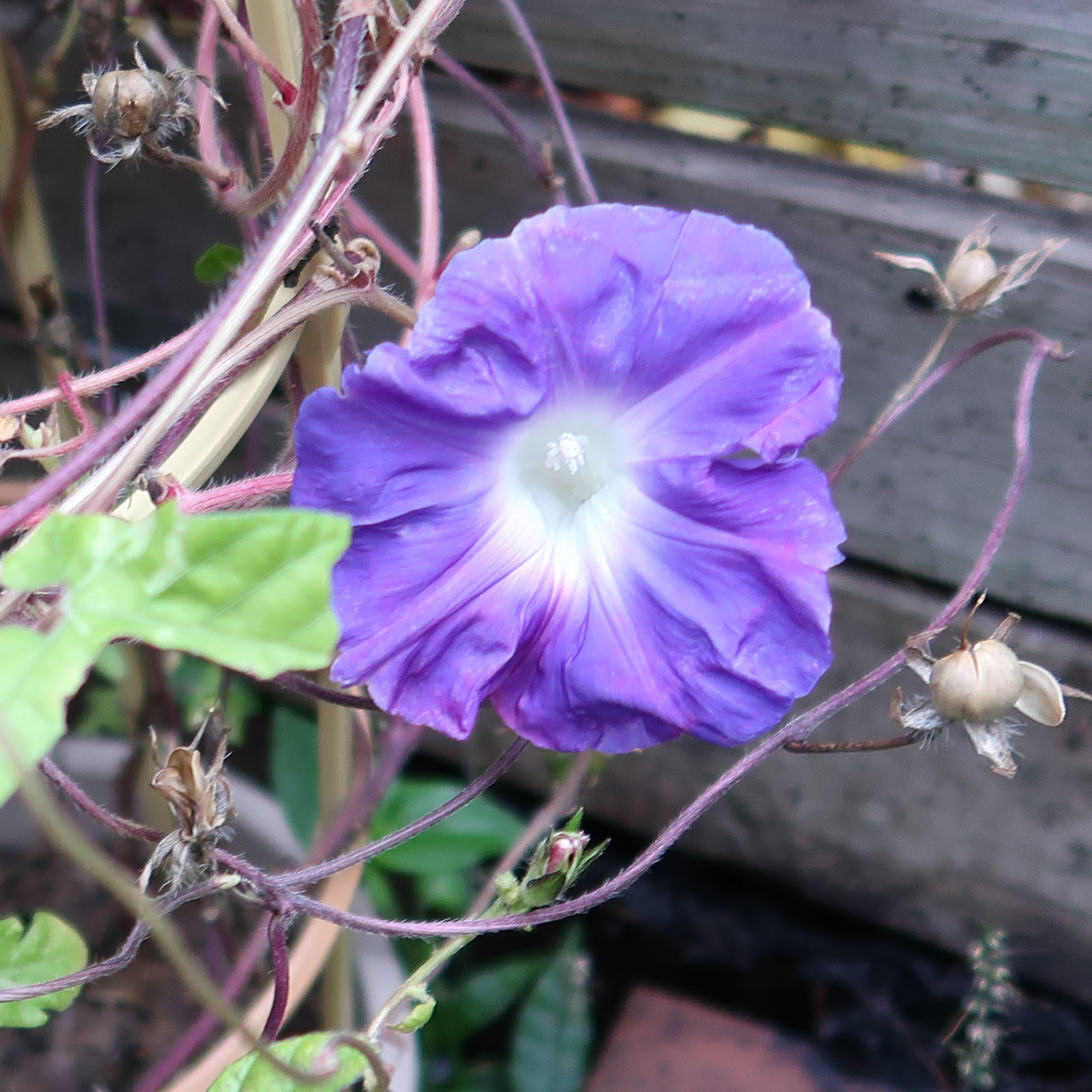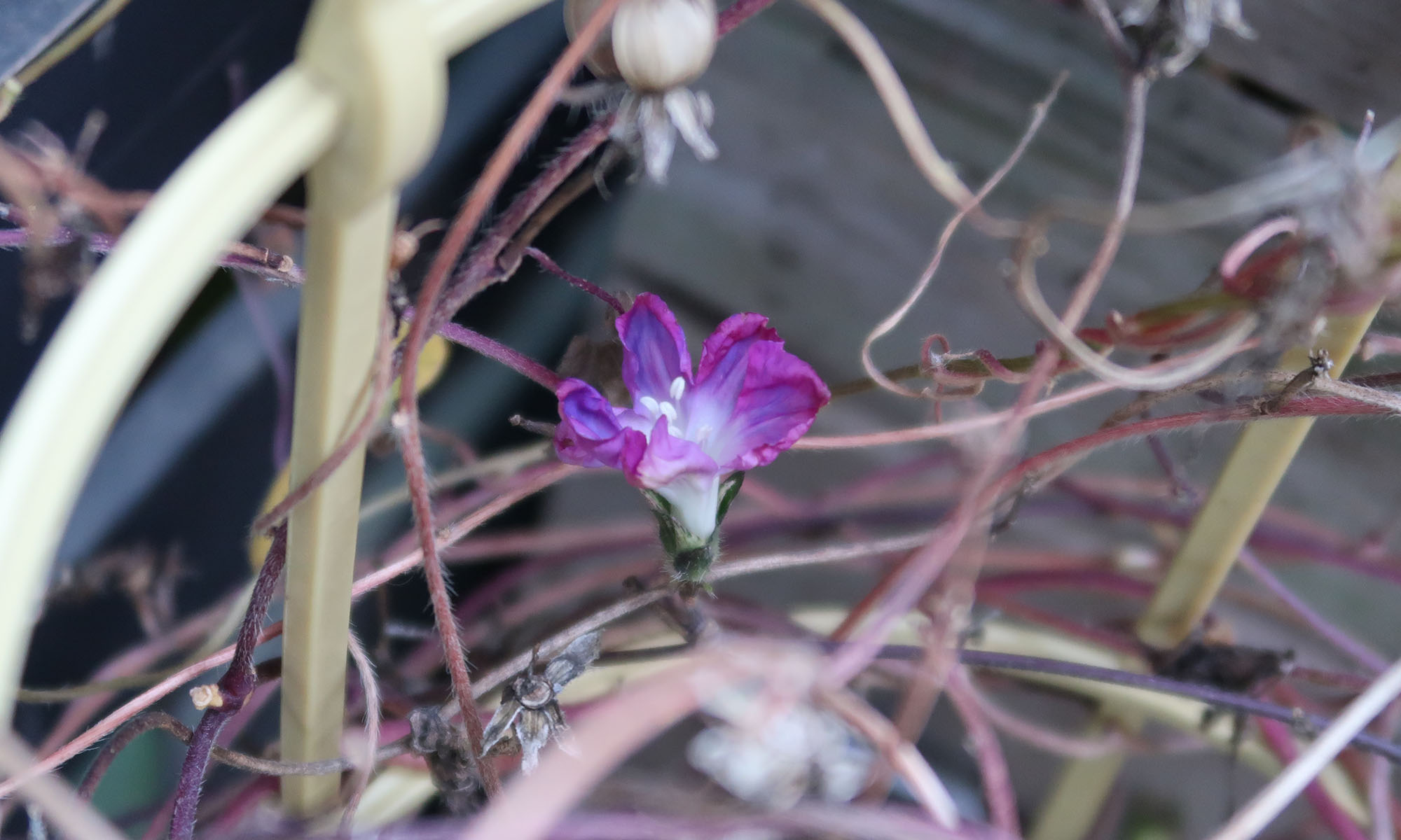 枯れる寸前の朝顔が最後の一花を二日間咲かせた。