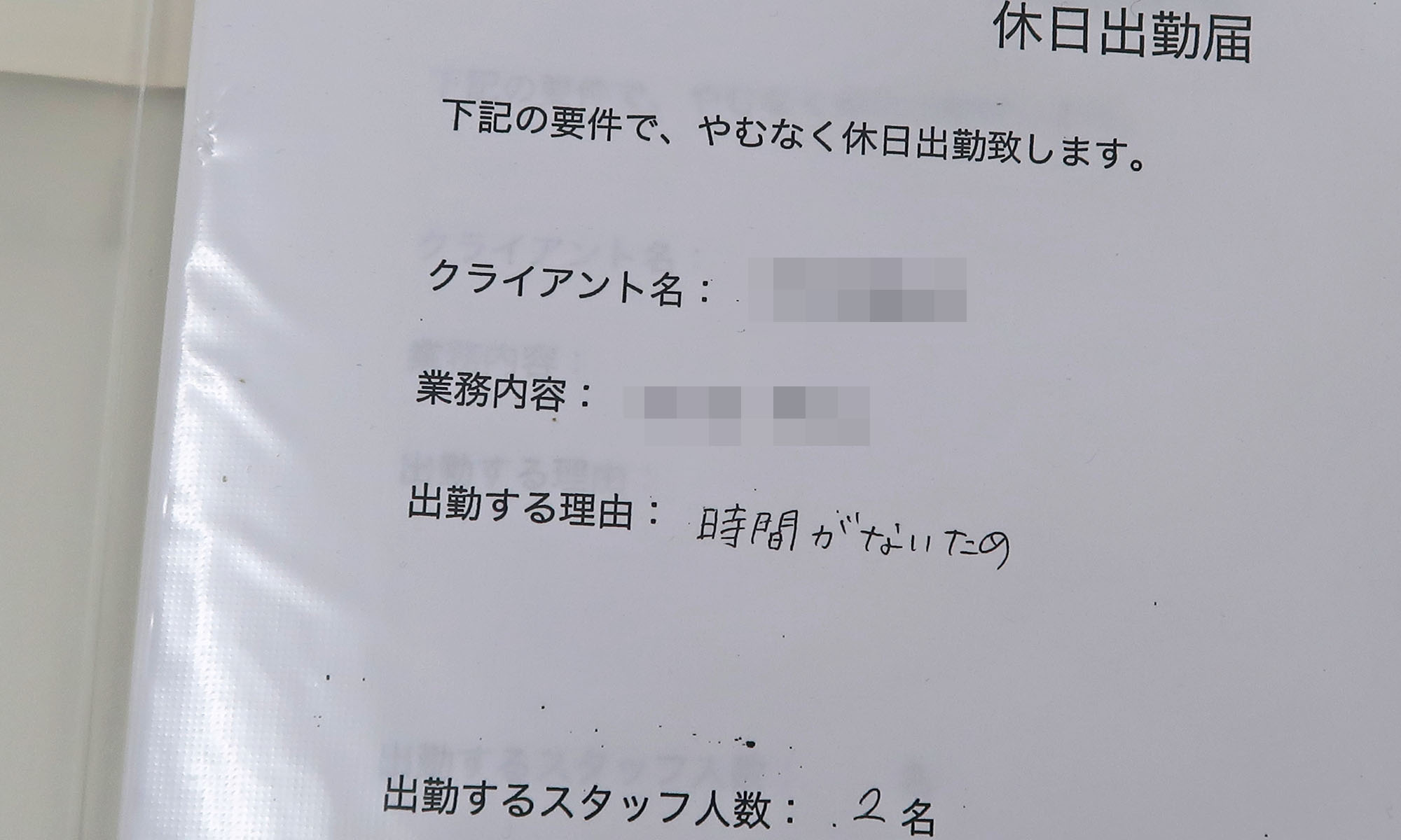 弊社の休日出勤届けの記入見本なのですが「出勤する理由」がバカっぽすぎて情けない