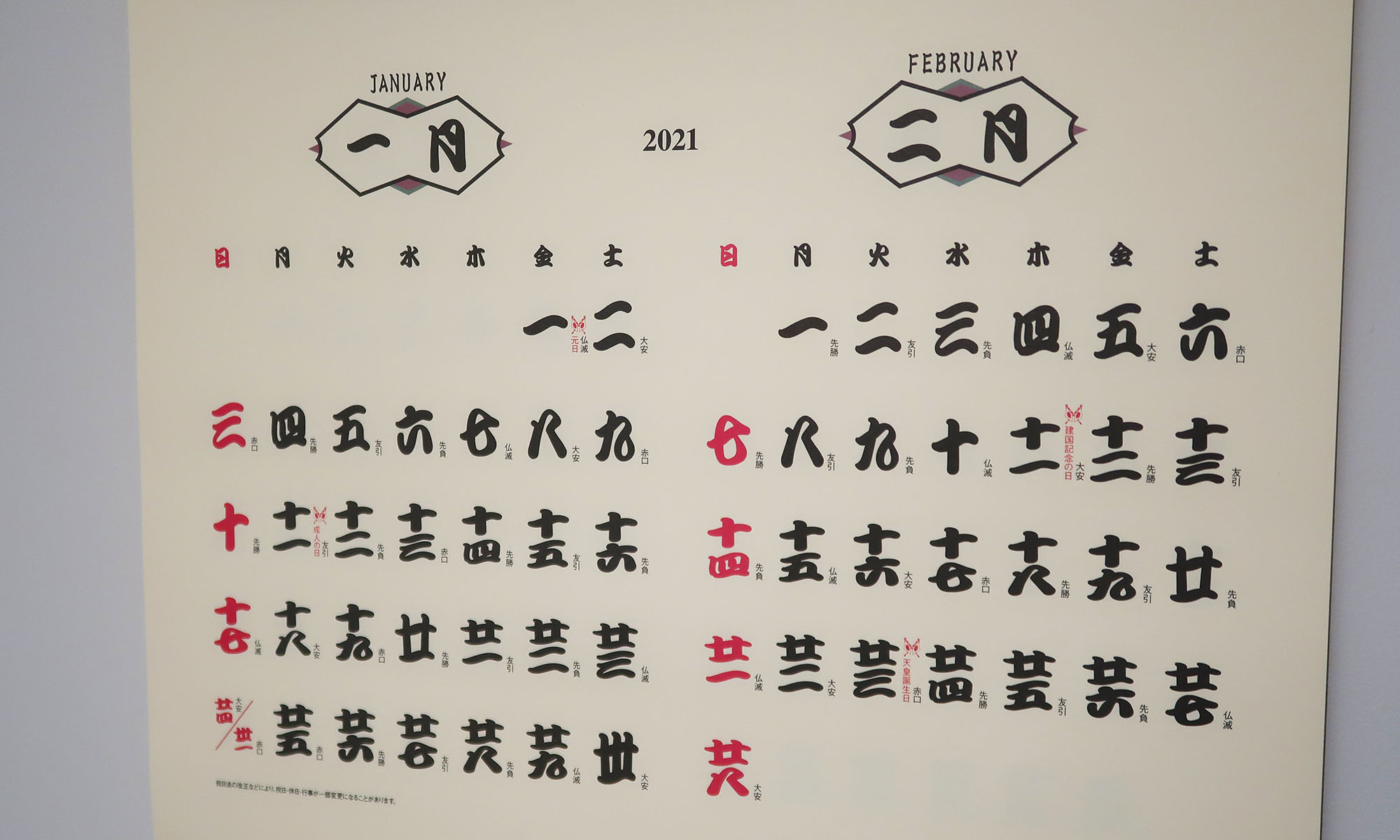 JANUARY、FEBRUARYと書いてないと読めない人だと日にちが判らないでしょこのカレンダー。