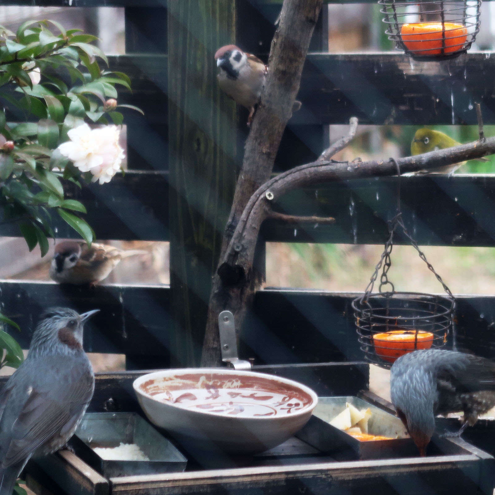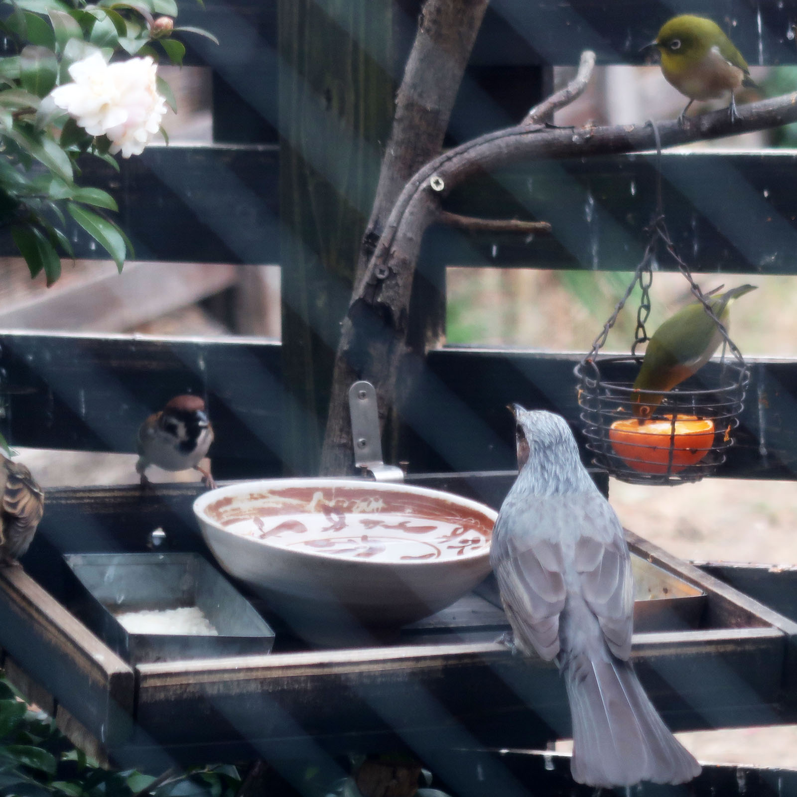 スズメ、メジロ、ヒヨドリが何故かいつも同時にやって来て騒いでます。