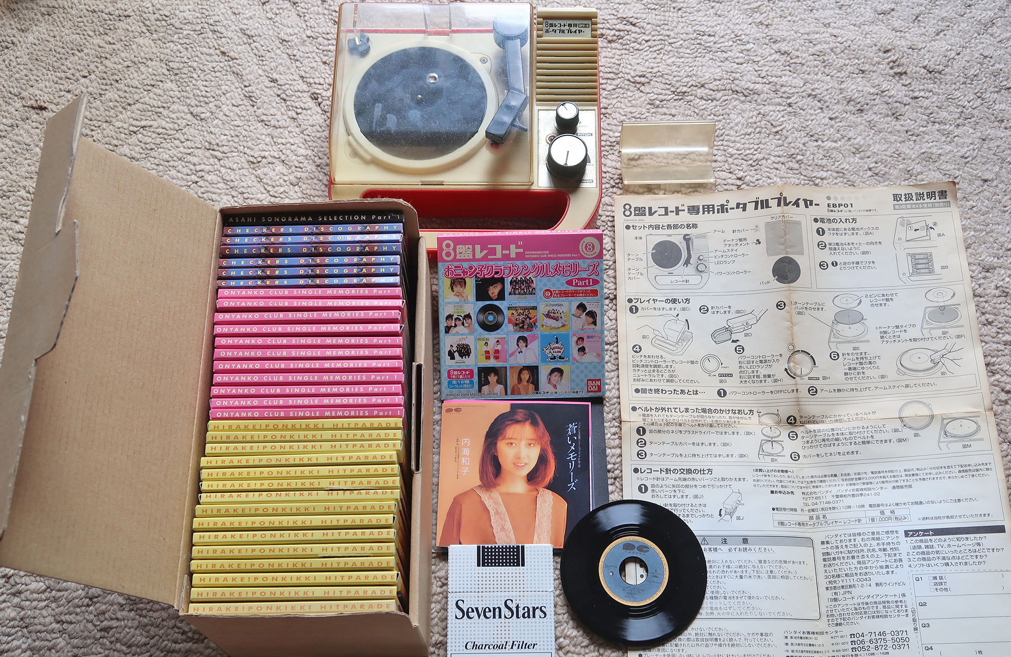 従兄弟の家で発掘した、直径8cmのアナログ盤「8盤レコード」と、バンダイ製のプレーヤー。
