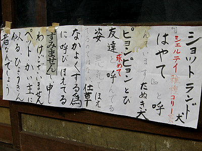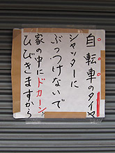 ![]() 正しくは「シェットランド」。 要するに、愛犬が友達を求めて吠える事を詫びているらしいです。すみません。 2009年11月18日 北区 豊島 ![]() なんでアパートの前にアヒルが置いてあるのかなぁ。 こう見えて保険会社の代理店だったり? 補足(2011.03.10) どうやらあの「ロス疑惑」の三浦和義氏が 「フルハムロード」を経営していた時に輸入して 大ヒットさせた有名な電気スタンドらしいです 11月25日 足立区 興野 ![]() コスモスの自販機。 都内にも残っているのをたまに見掛けますね。 11月25日 足立区 興野 ![]() 「2番目」ってのはよく見掛けますけど。 1〜7番目を知りたくなりますね。 12月13日 北区 十条仲原 ![]() 店名がアトムだというのに、 どういうワケかルパンっぽい人物が描かれています。 12月13日 北区 十条仲原 ![]() 語順が悪いのでしょうか。 「飲んで」と「食べられる」が離れているせいでしょうか。 何故か「食われちまう」ように感じられるのです。 2010年2月3日 墨田区 文花 ![]() 何ですかね、ぱやよしって。 丼飯屋さんらしいのですが。 2月7日 江東区 北砂 ![]() ぱやよしの近所。 ぱ行が流行ってるのかな・・。 2月7日 江東区 北砂 ![]() 大賑わいの商店街でシャッターを閉じていると、 こういう被害があるようです。 2月7日 江東区 北砂 ![]() よく見ると左足を前後両方上げています。 自動車の片輪走行と同じ。かなりのバランス感覚です。 2月7日 江東区 北砂 ![]() 「スターダスト」なら綺麗な意味もあるでしょうが、 ダストの日は「ゴミの日」になっちまう気が。 2月9日 中央区 日本橋 ![]() 「イッチ」だけを省略するとは大胆な言語感覚。 本当は「サンドする」というのもおかしな言葉なのですが。 2月17日 品川区 南大井 ![]() 点々が消えてしまっただけですけど。 「東京カス」って情けない感じ。 4月29日 北区 志茂 ▼2ページへ進む やだなぁ Top |