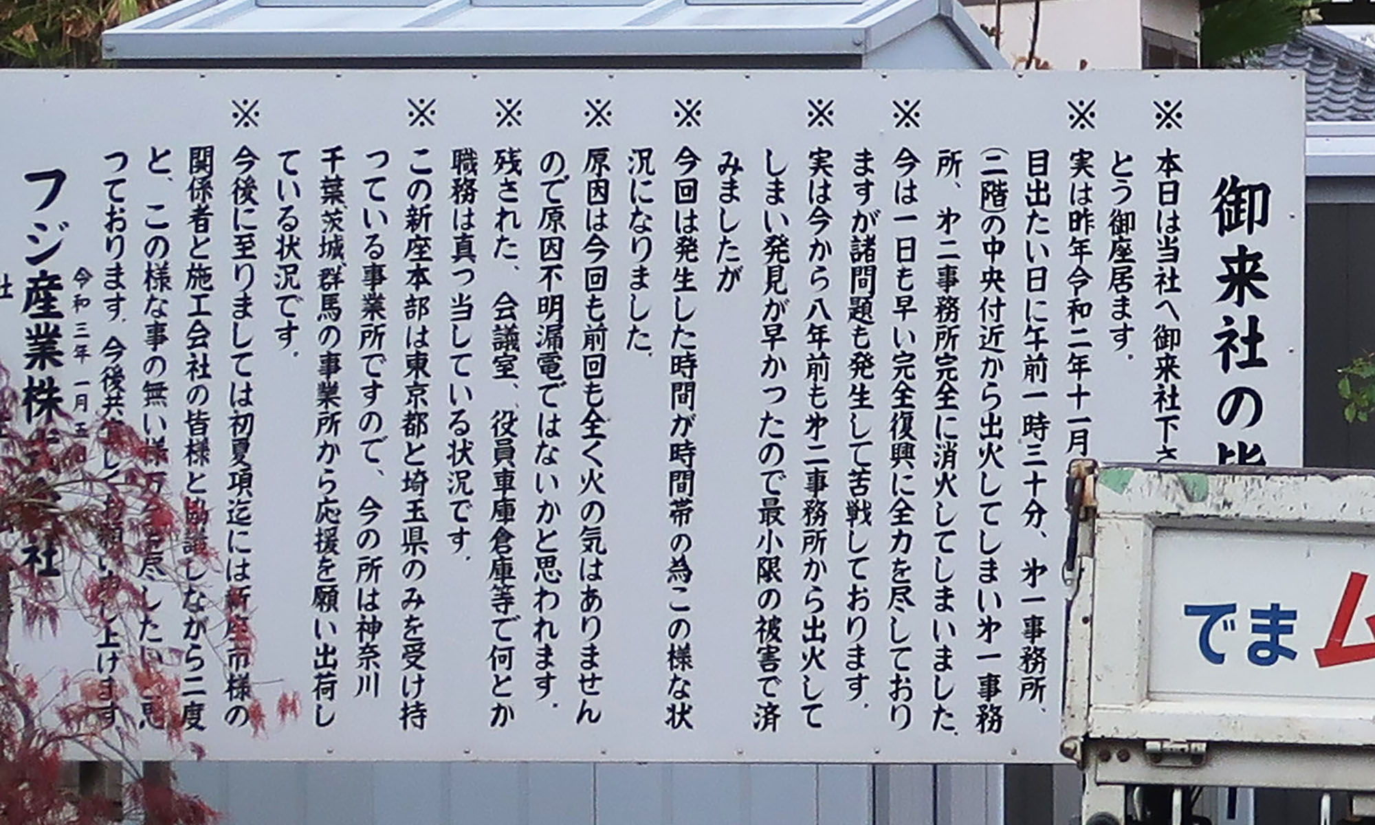 火災についての説明が背後に。ここまで開示する会社はあまりないかも?